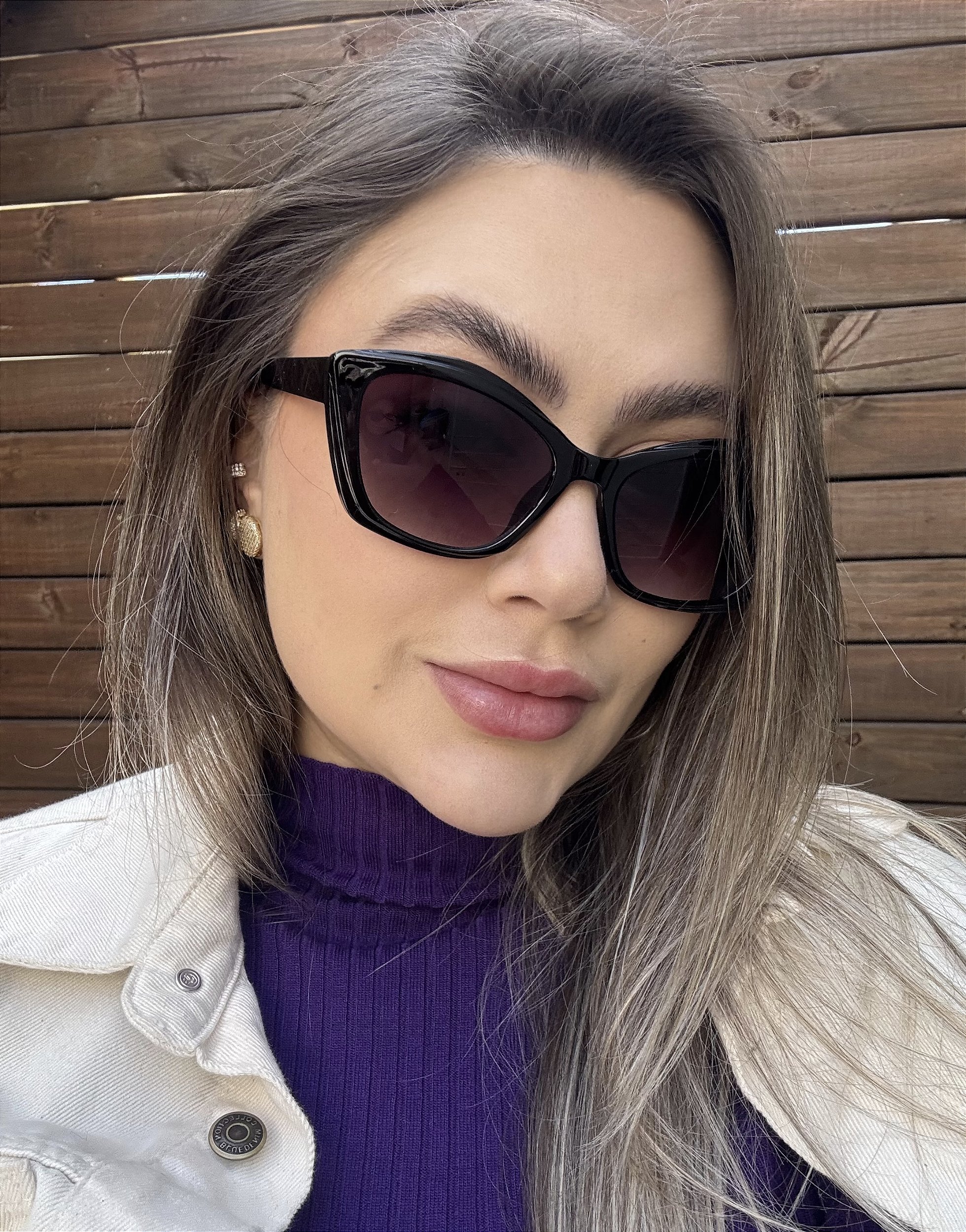 Modelo em acetato italiano preto com lentes pretas degradê, tamanho médio e levemente gatinho, perfeito!