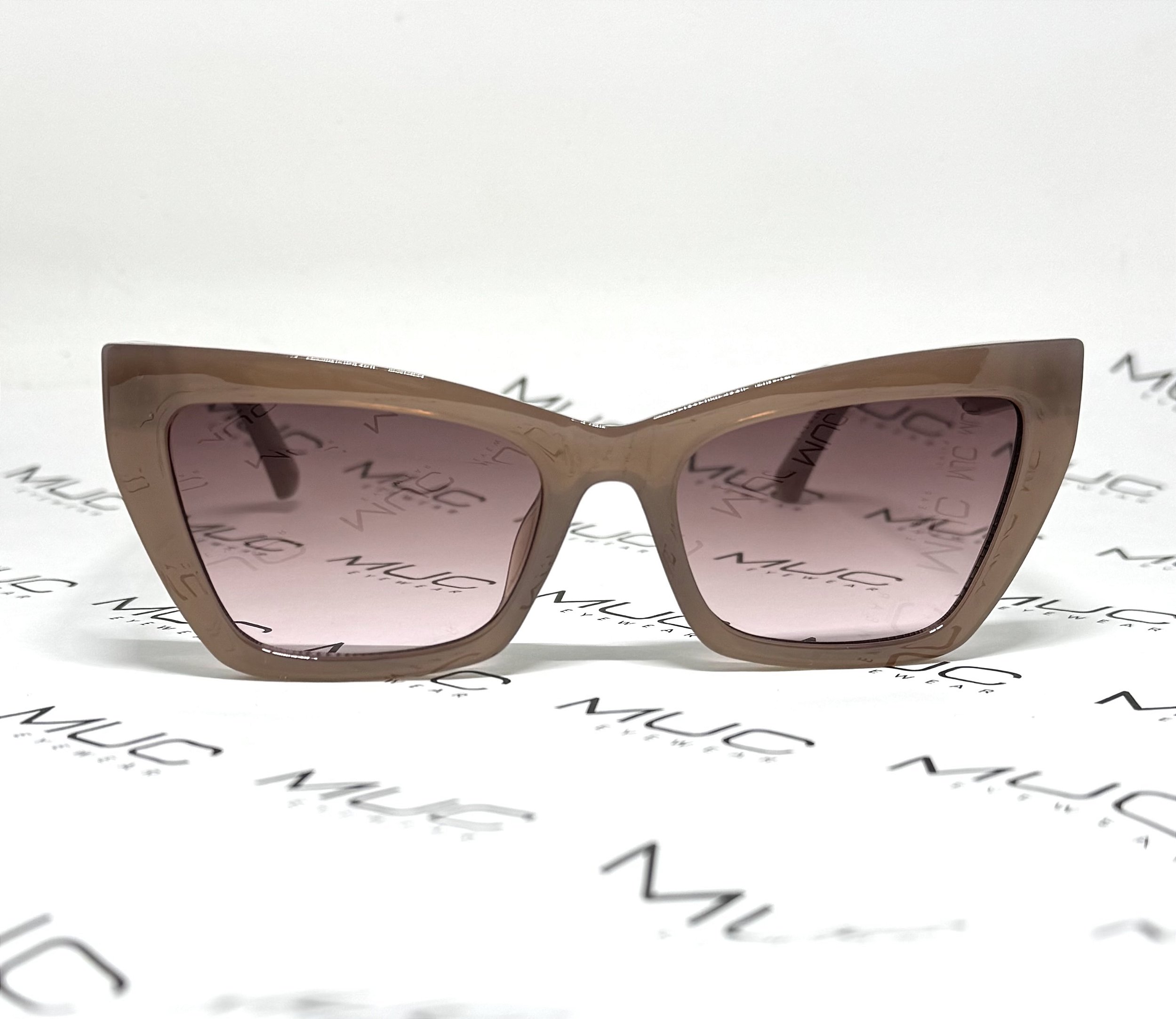 Modelo em acetato italiano rose translucido, lentes degradê, tamanho médio e levemente gatinho