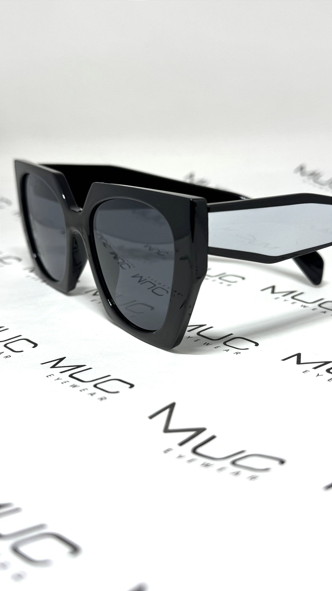 Modelo grande, todo em acetato italiano preto, lentes pretas e lateral com detalhe branco, óculos extremamente elegante!