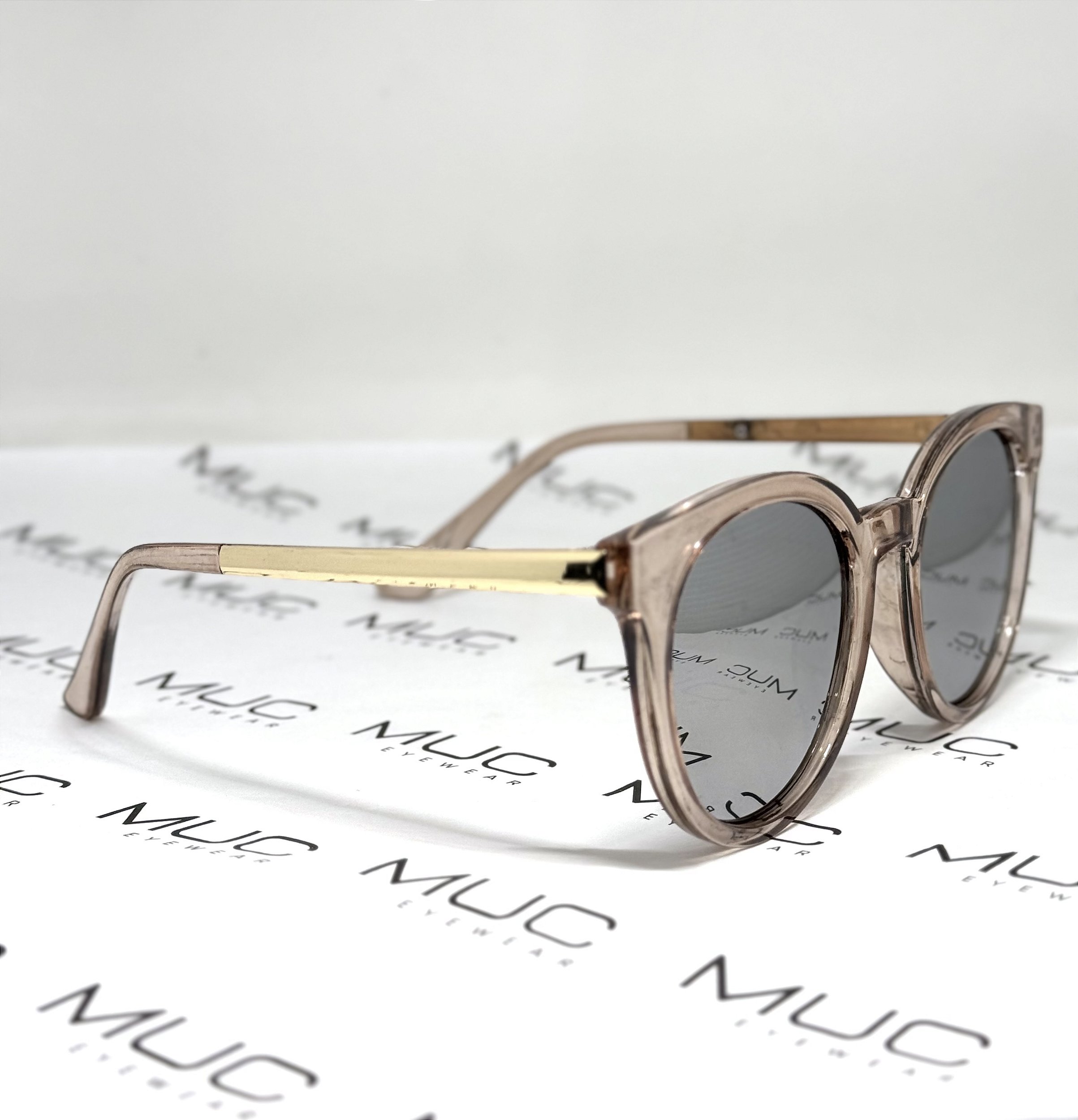 Modelo em acetato translúcido nude, lentes epelhadas cinza e datalhe na haste dourado!