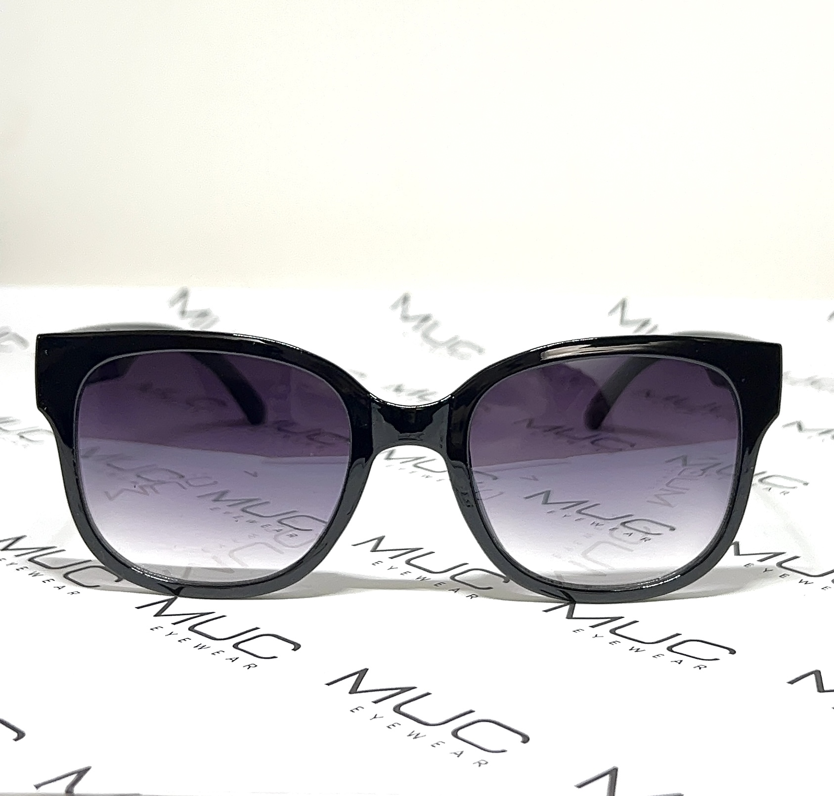 Modelo em tamanho médio, em acetato preto e lentes degradê